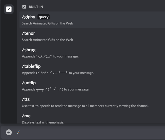 {token discordbottokengoeshere, accessKey awsaccesskeygoeshere, secret secretaccesskeygoeshere} Lastly, type node mainjs in command line to run the code and your bot should appear online in your discord server;If you type /tts instertmessagehere discord will read the message out for youDiscord Chat Slash Commands Here are all the basic Discord chat slash commands wiki list Advertisement Command Function /unflip Send this emote through messages ┬─┬ ノ ( ゜゜ノ) /tts word or phrase Use text to speech to read your message for users in the channel